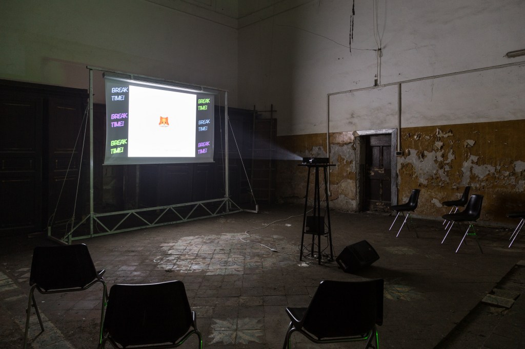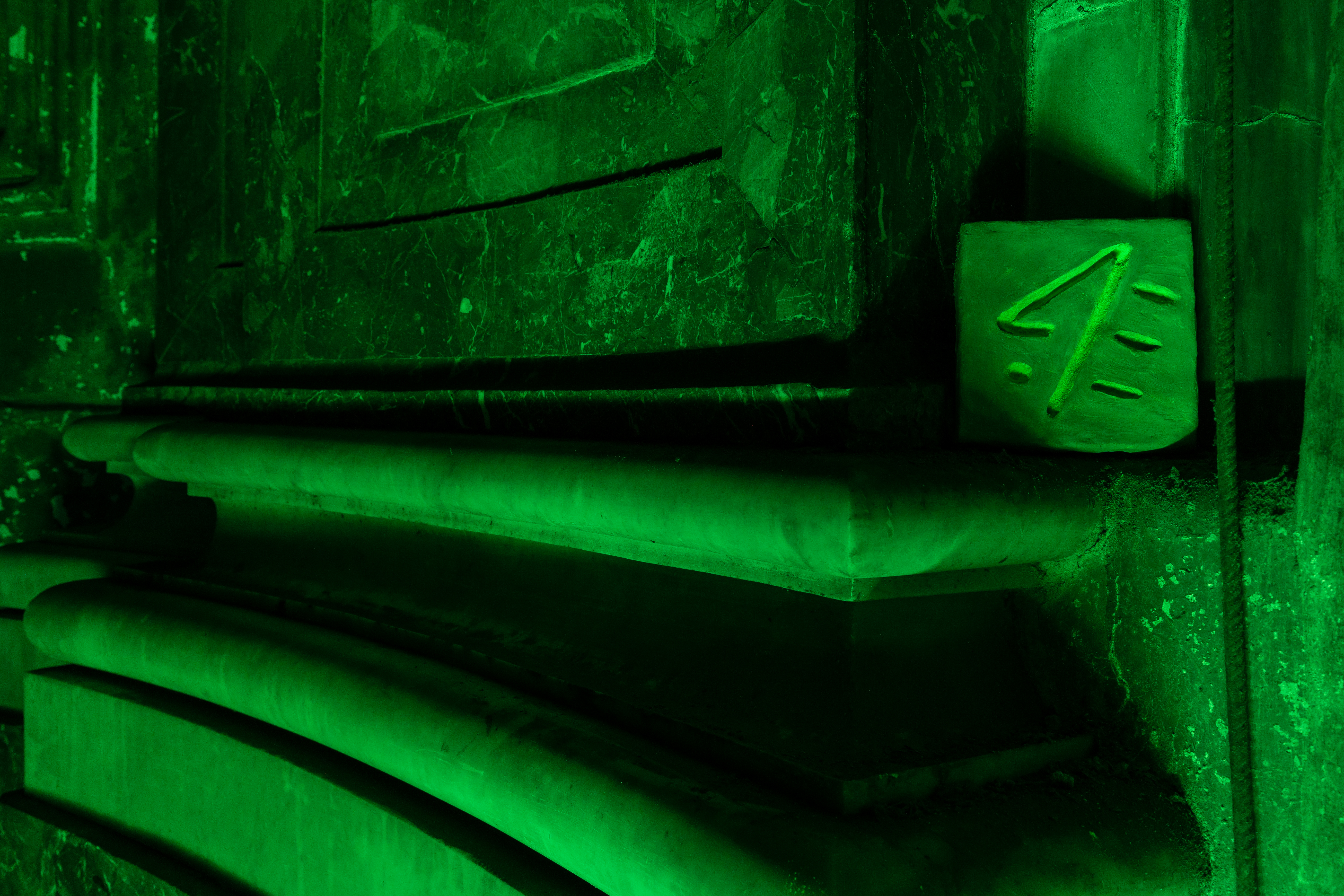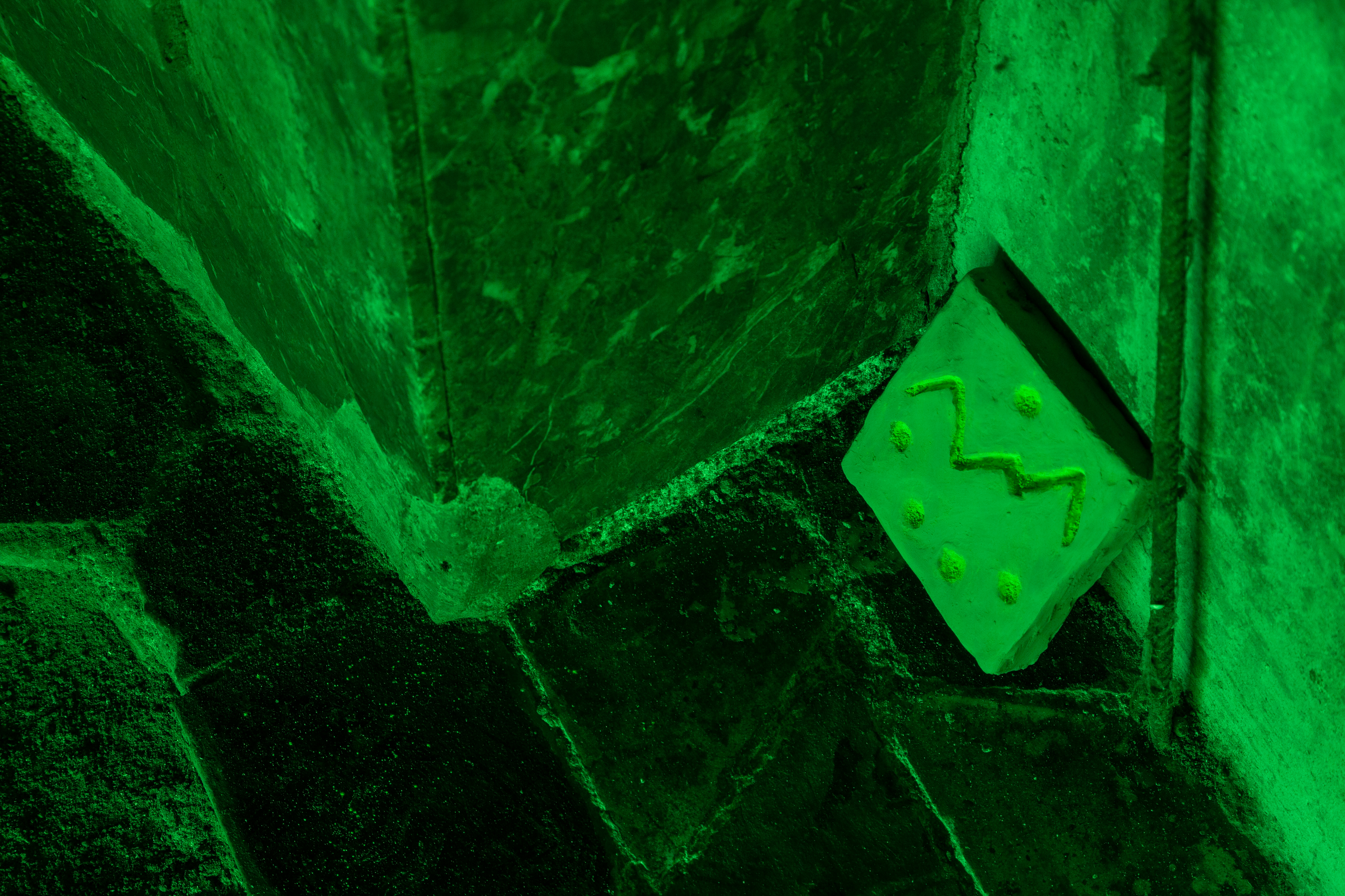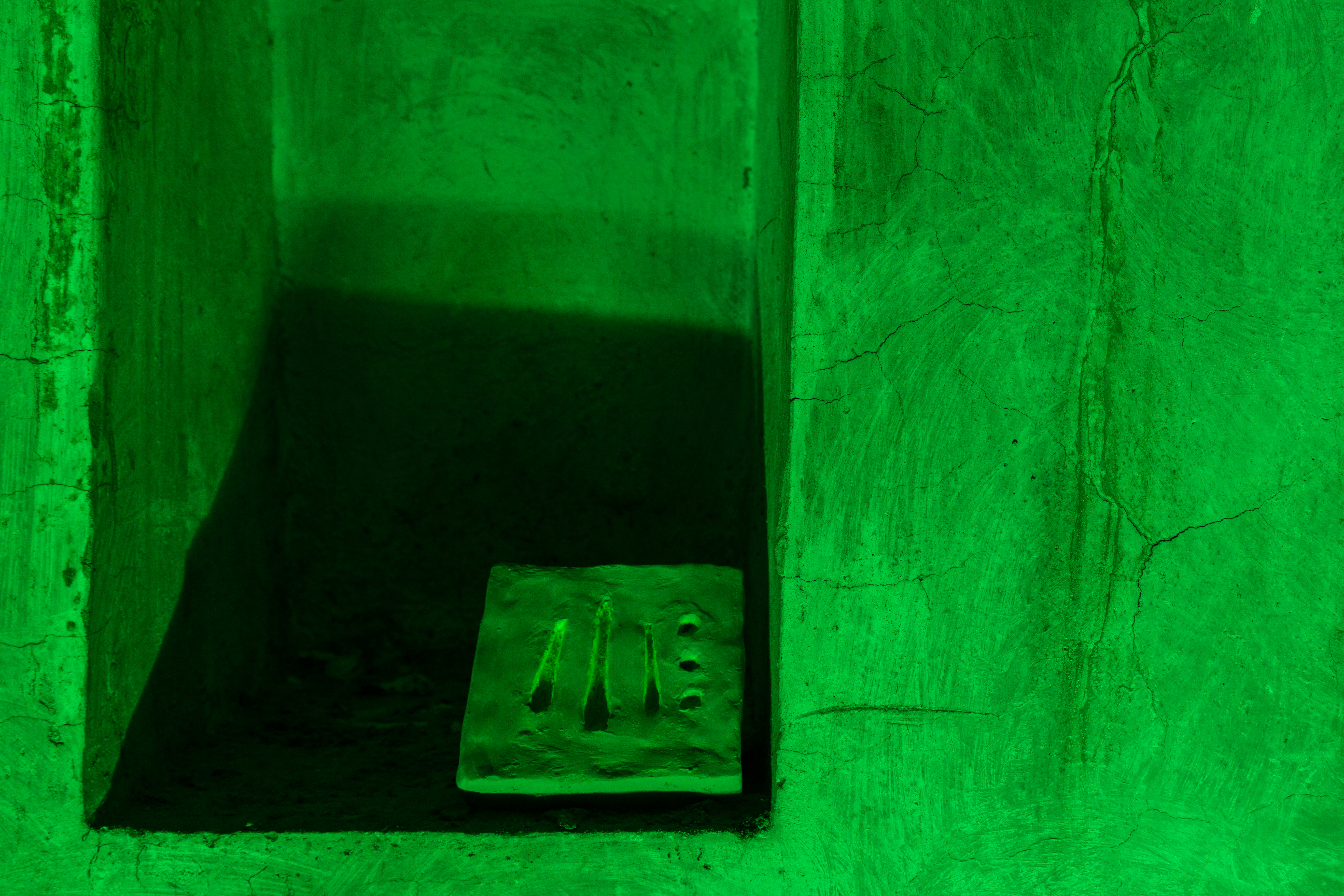 Untiled is an experiential composition of incomprehensible nature. It could be a challenge for human intellect or a simply combination of things: incised clay, pigment, smoke and neon.