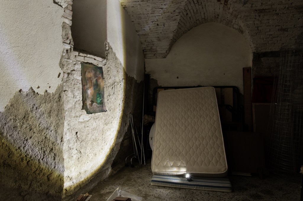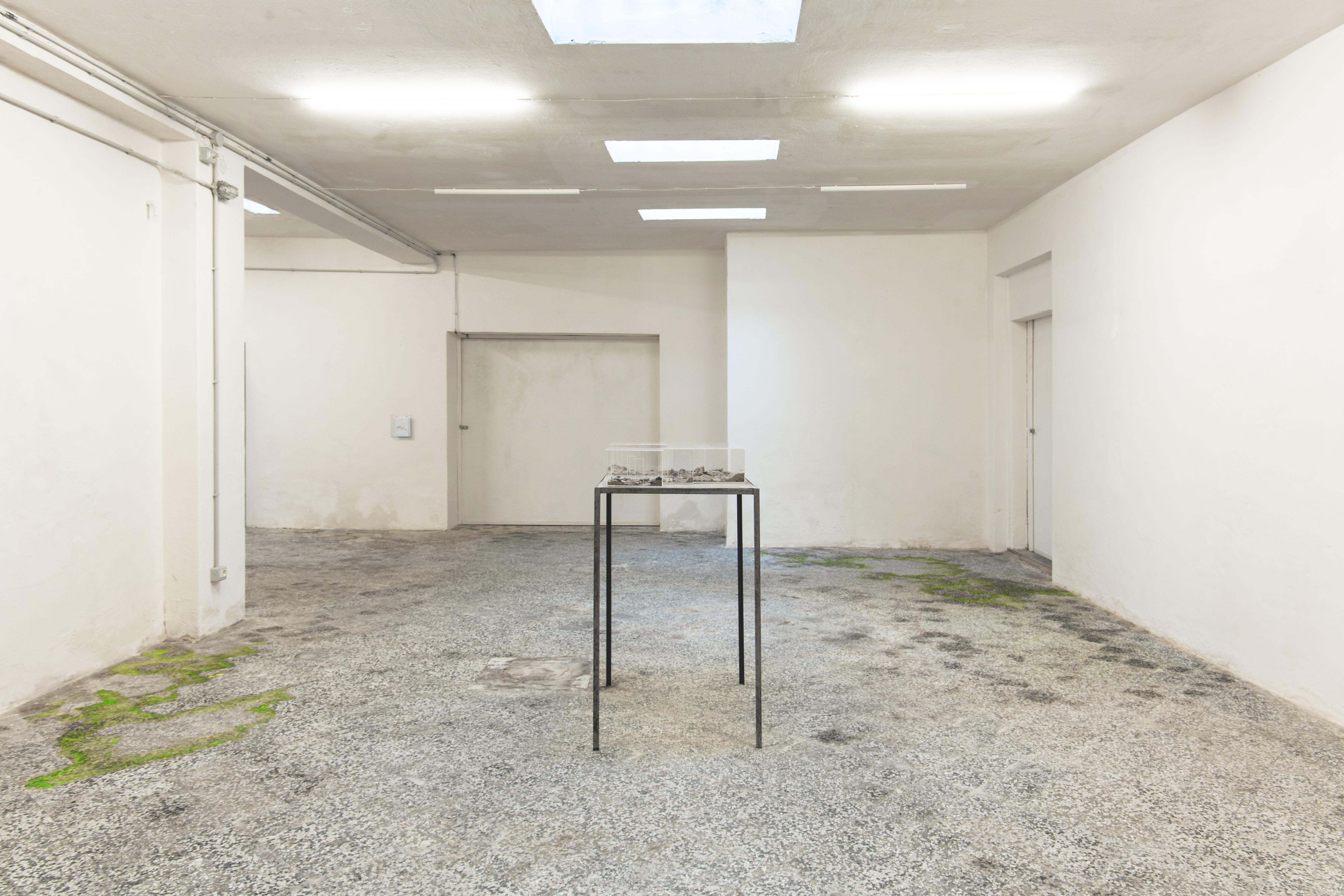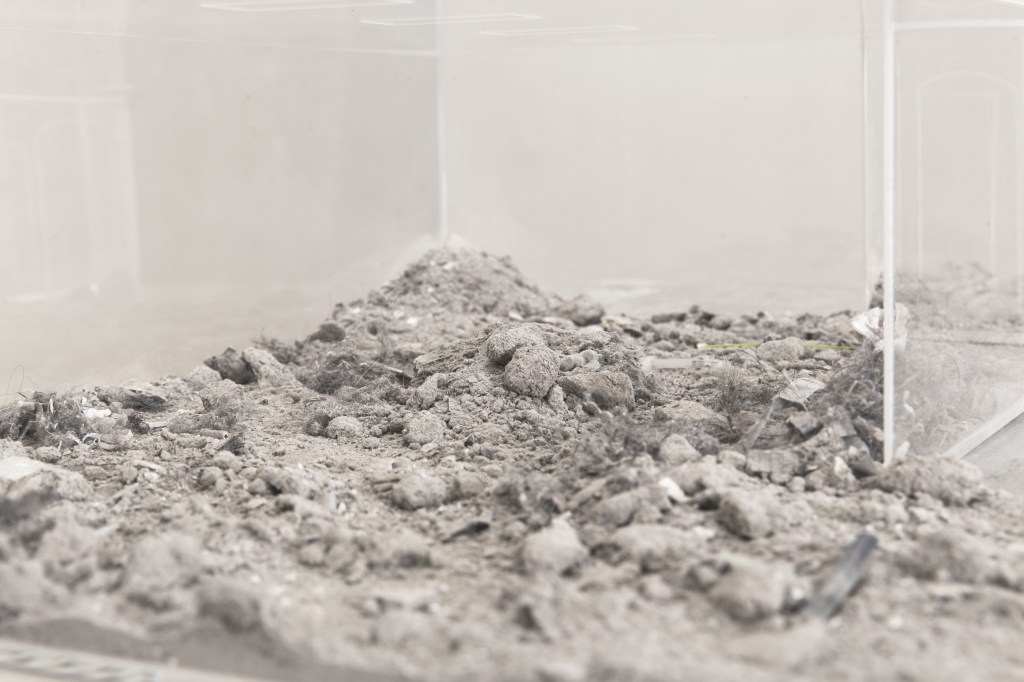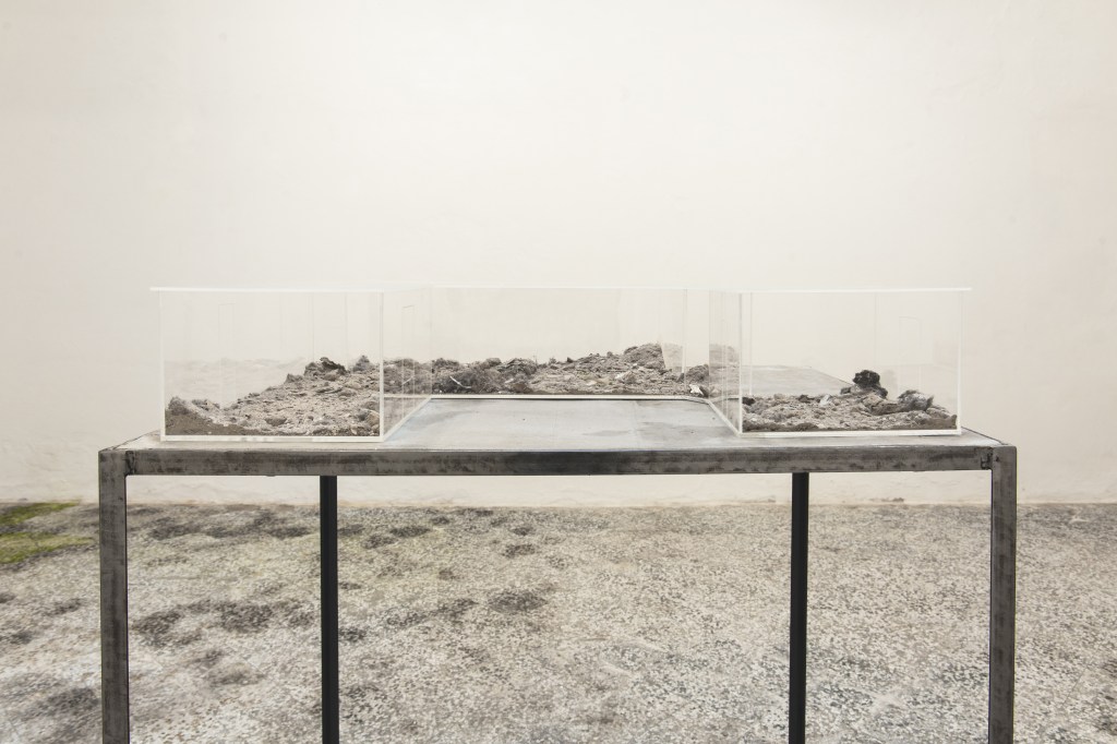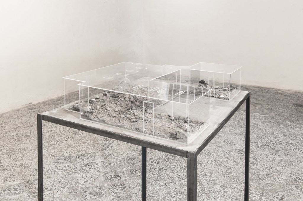 The main room of Sottofondo is inhabited by a scale reproduction of the exhibition space itself, highlighting what is normally sought to hide and altering the scale of spatial values to we are used to. In fact, inside the model, local waste – such as dust, rubble and other debris – has been carefully preserved.