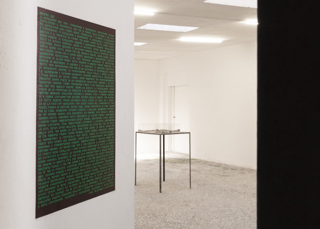 Roberto Casti’s exhibition is a project that combines site-specific artworks, dedicated to Sottofondo studio, and new productions. The works on display are suggestions that lead us to look at the other, what is outside us, at the “here and now”: disturbing elements such as dust, debris and stains on the floor are essential parts of works that – for the artist – become devices of awareness.