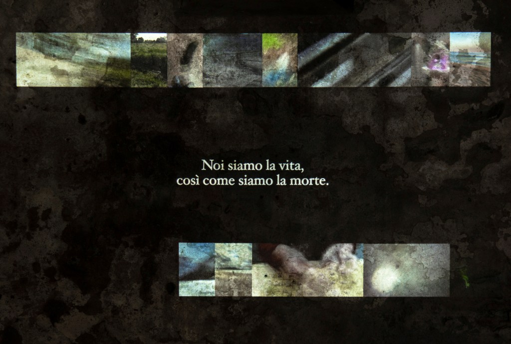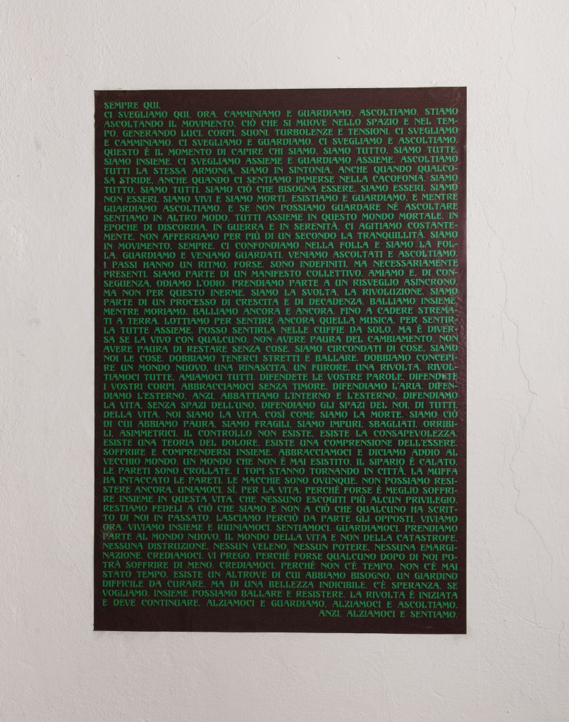 In the last room of Sottofondo Studio, there is a video installation accompanied by a manifesto. This work is made of different videos belonging to friends and people with whom I have a close relationship. This work brings together moments from the past in which all these people felt really present, in which they went beyond their own individuality.