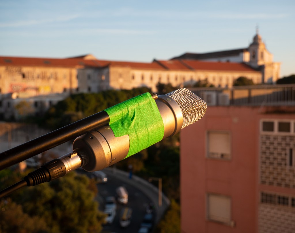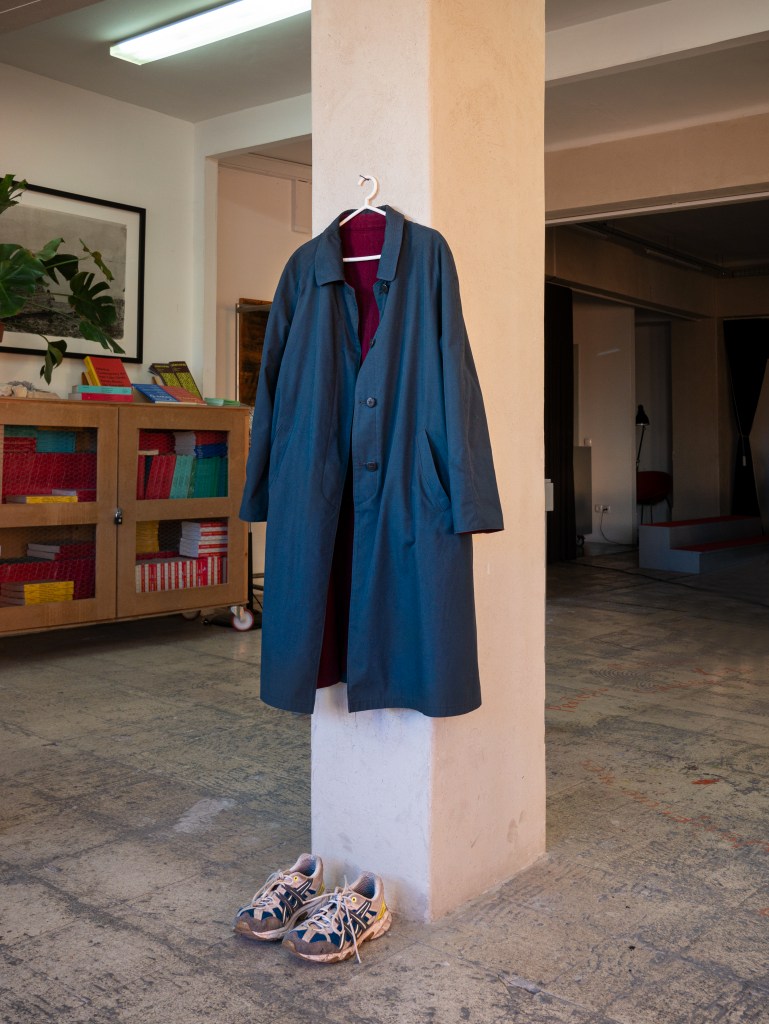 A microphone, directed toward the outside of the building, captures and amplifies the sounds of the city, which are then broadcast through a speaker concealed within a hanging coat, accompanied by a pair of shoes. These garments, belonging to the artist, serve as personal items and symbolic bridges between the interior and exterior realms. While clothing protects, it also carries traces of the outside world into the inside. The sound transmitted through the speaker is altered, resembling a music track, underscoring the connection between the artistic act and the essential role of the surrounding environment.