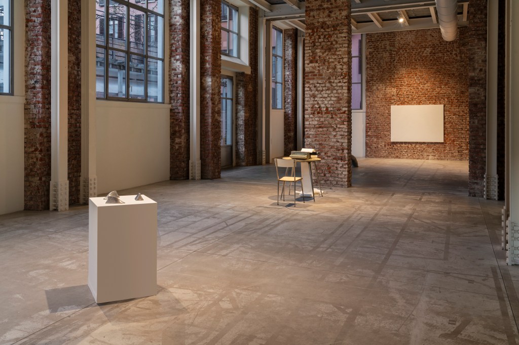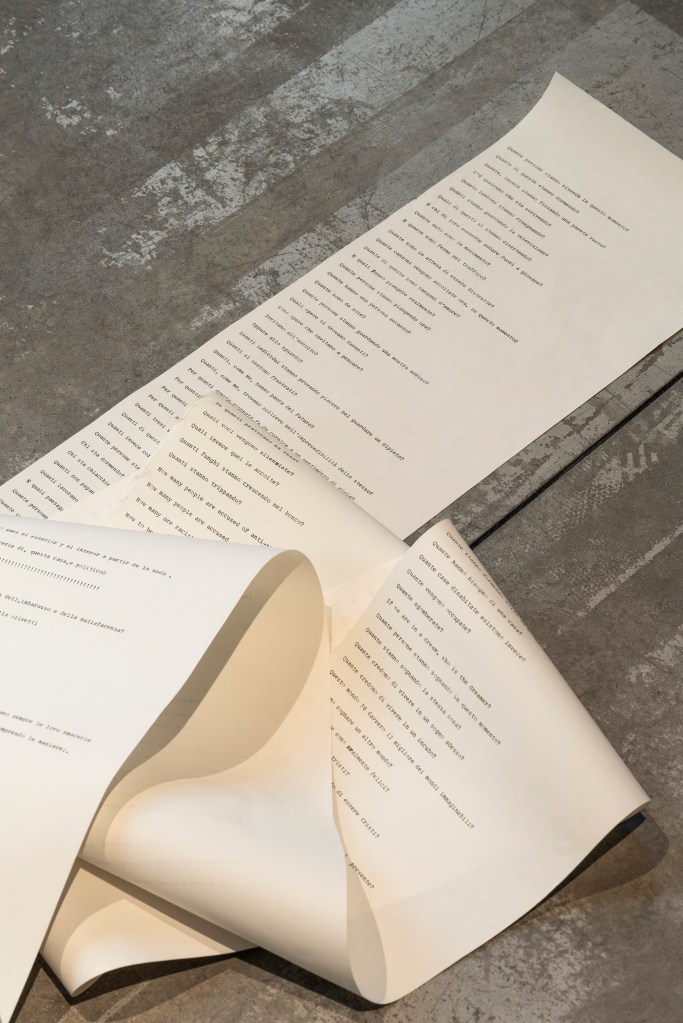 The performative installation Aleph (Milan-Berlin-Lisbon-Milan) includes a typewriter that the audience can use to contribute to a list of questions—started during the Berlin exhibition and continued during the Hangar artist residency in Lisbon—that reflect on one’s position in the world and in their historical time.