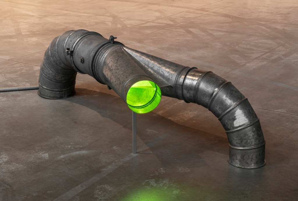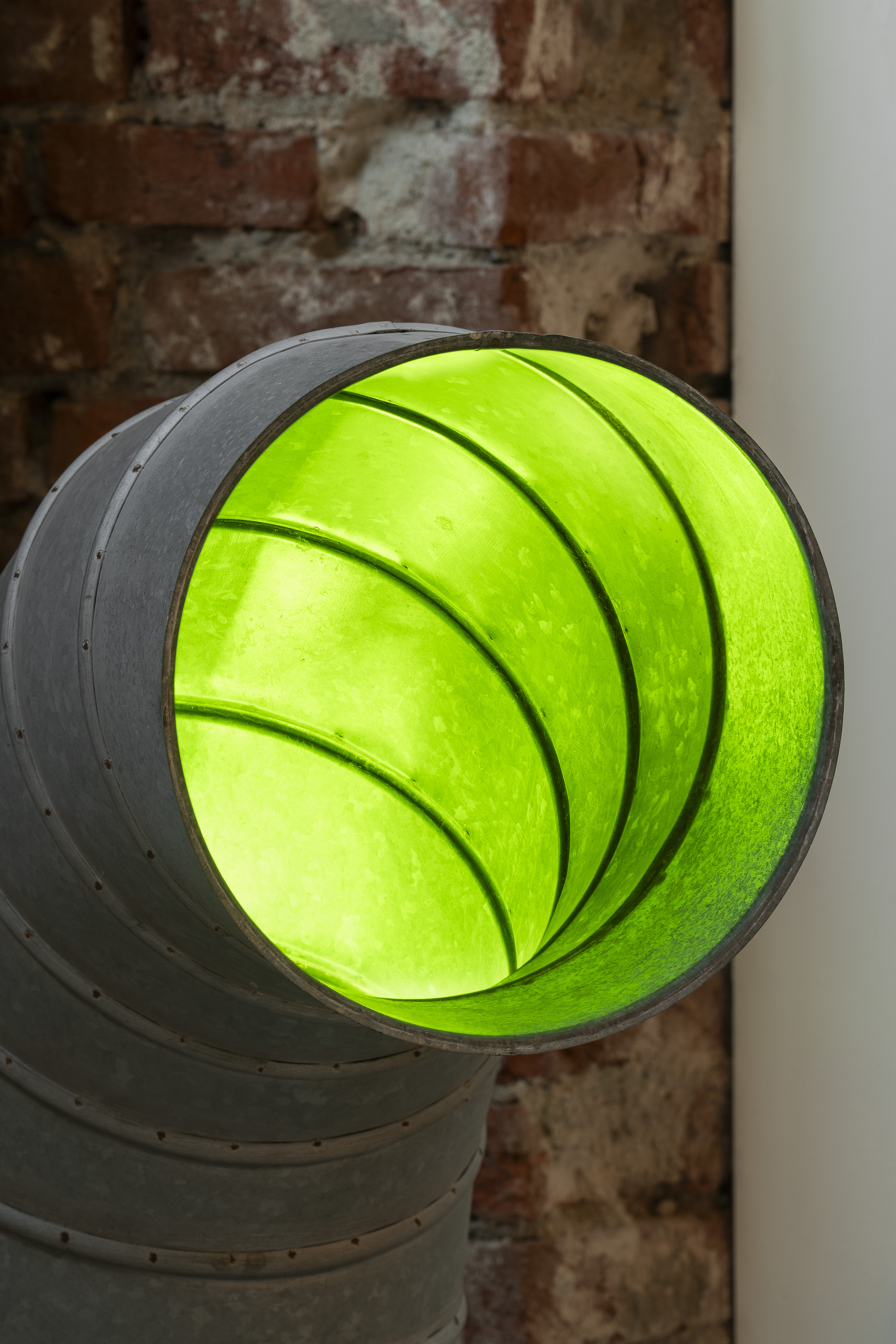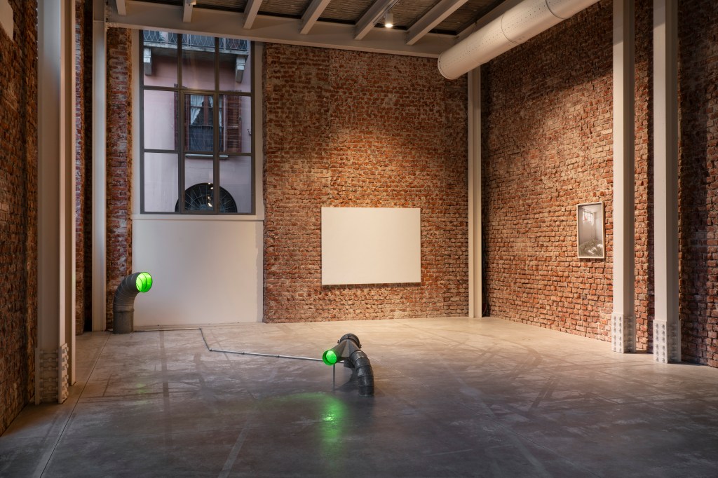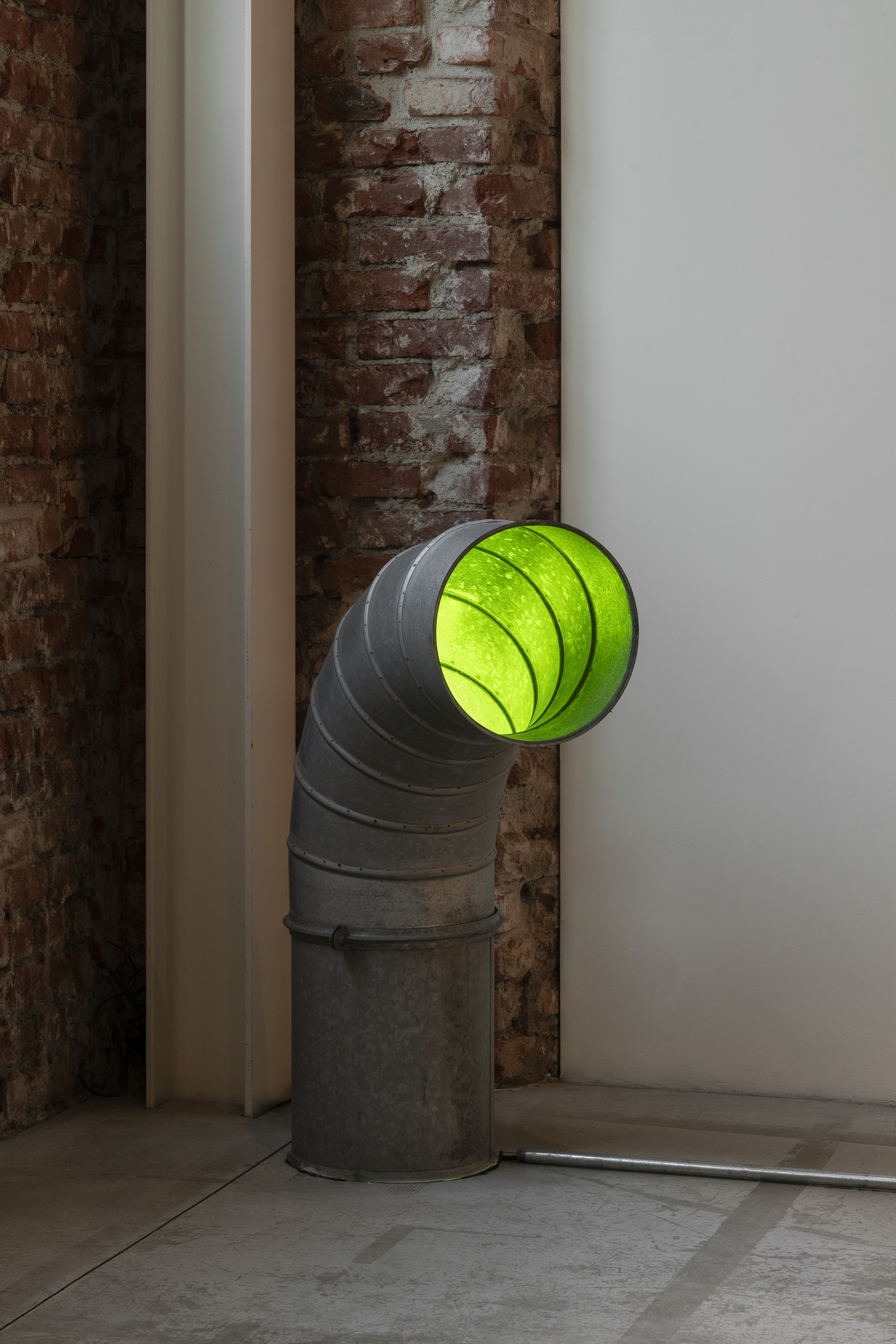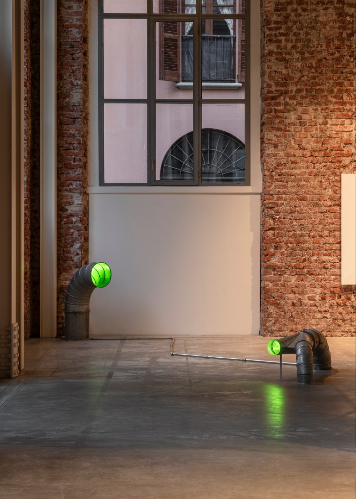 Roberto Casti continues his exploration of marginal connections linking the inside and the outside by advancing the Aleph series (2023 – ongoing), initiated during the first chapter of Fernweh in Berlin. To create these works, the artist collected recordings, his own or those belonging to friends, from cities far apart, which he then modified and slowed down to create ambient soundscapes where all spatial and temporal data is obscured. The tracks are usually played through devices the artist defines as “non-objects,” apparatuses occupying the margins of any domestic or commercial environment, such as junction boxes, drainage pipes, water tubes, and ventilation ducts. Using these devices as unusual resonators, the artist highlights what inhabits the edges of everyday spaces, reinterpreting the connections linking indoor living spaces to the outdoors, the micro to the macro, the individual to the planet.