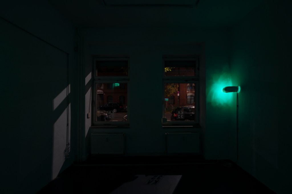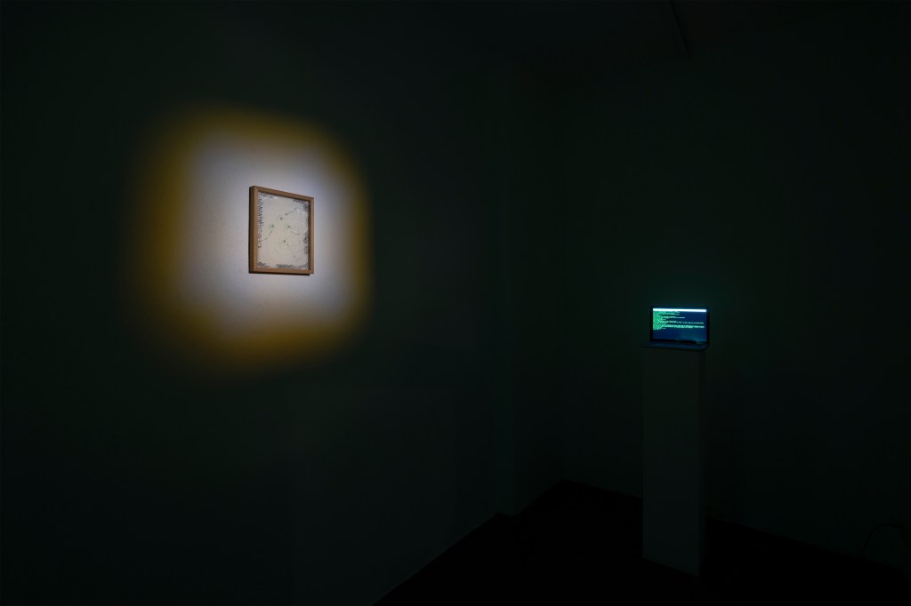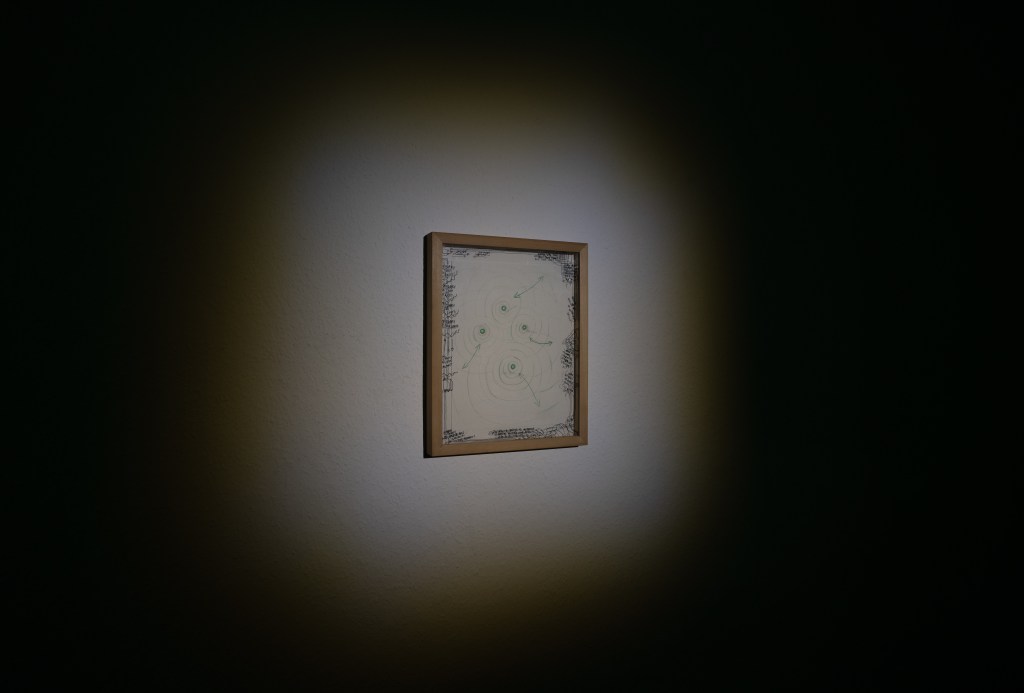 exhibition, is considered the graphic apparatus of a performance titled Aleph (Milan-Berlin), which will be presented on the opening day with the presence and voice of Dalia Maini. The text/work, in continuous growth, is a device of spatiotemporal awareness, an attempt at impossible empathy that shifts attention from the individual to the collective, assuming a reversal of one’s existential condition linked to their personal sphere.